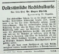 Ehrlich, Eugen, Volkstümliche Hochschulkurse, Czernowitzer Allgemeine Zeitung vom 24. Dezember 1905, S. 2 f.