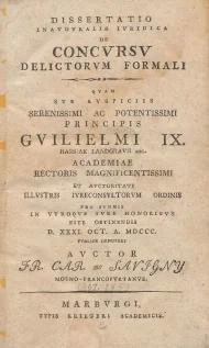 Savigny, Friedrich Carl von, Dissertatio inauguralis iuridica de concursu delictorum formali, Marburg 1800